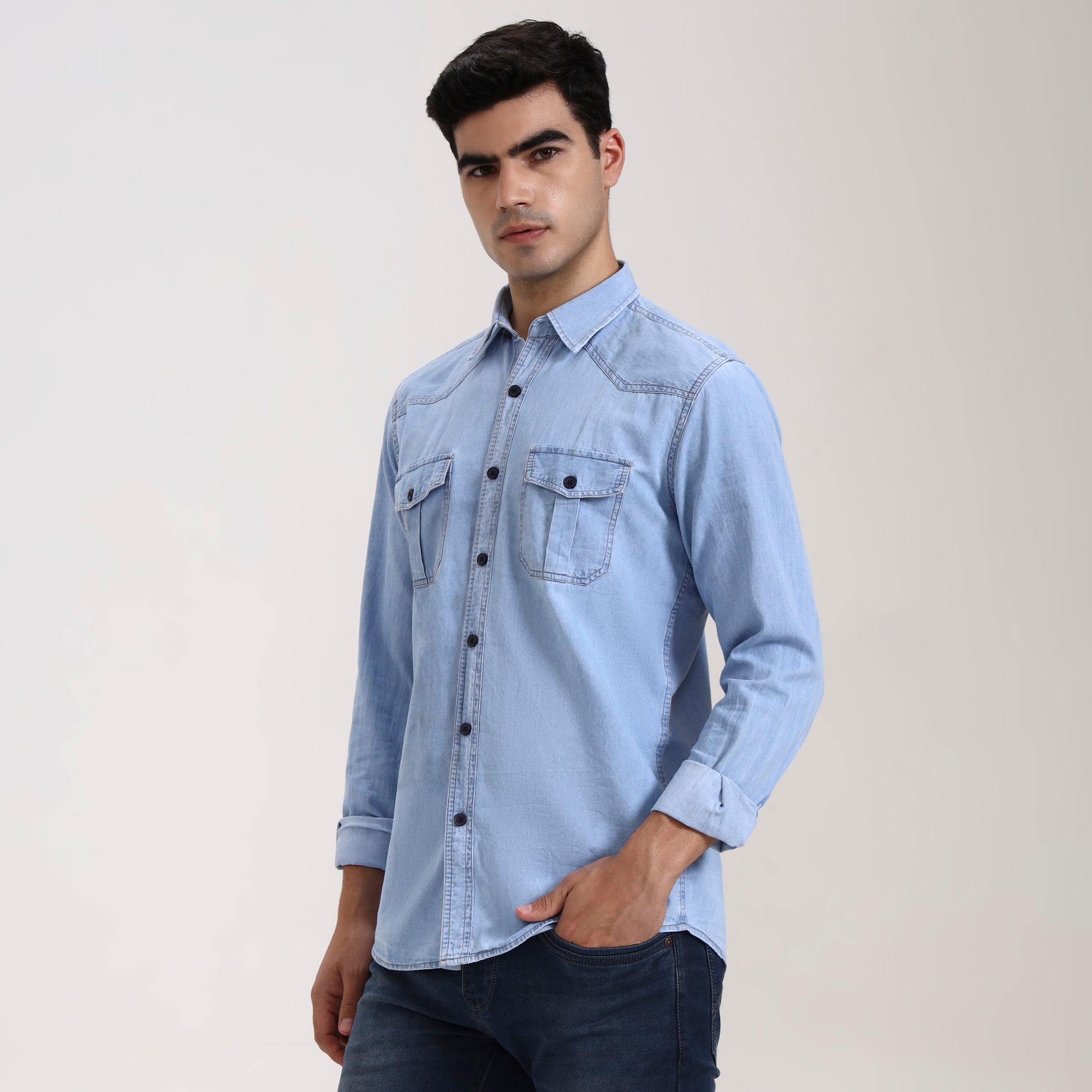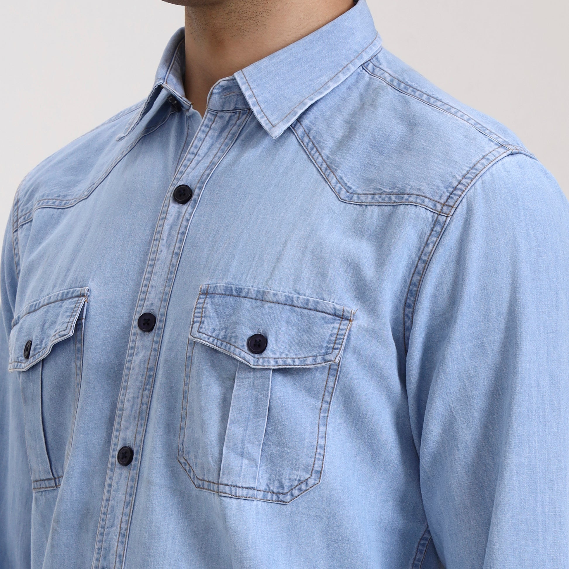 Breezy, versatile, and effortlessly confident — the Aero Light Wash Denim Shirt is your go-to essential for days that demand both comfort and character. Crafted in lightweight cotton denim, it gives the laid-back appeal of denim with a refined Blanford finish.